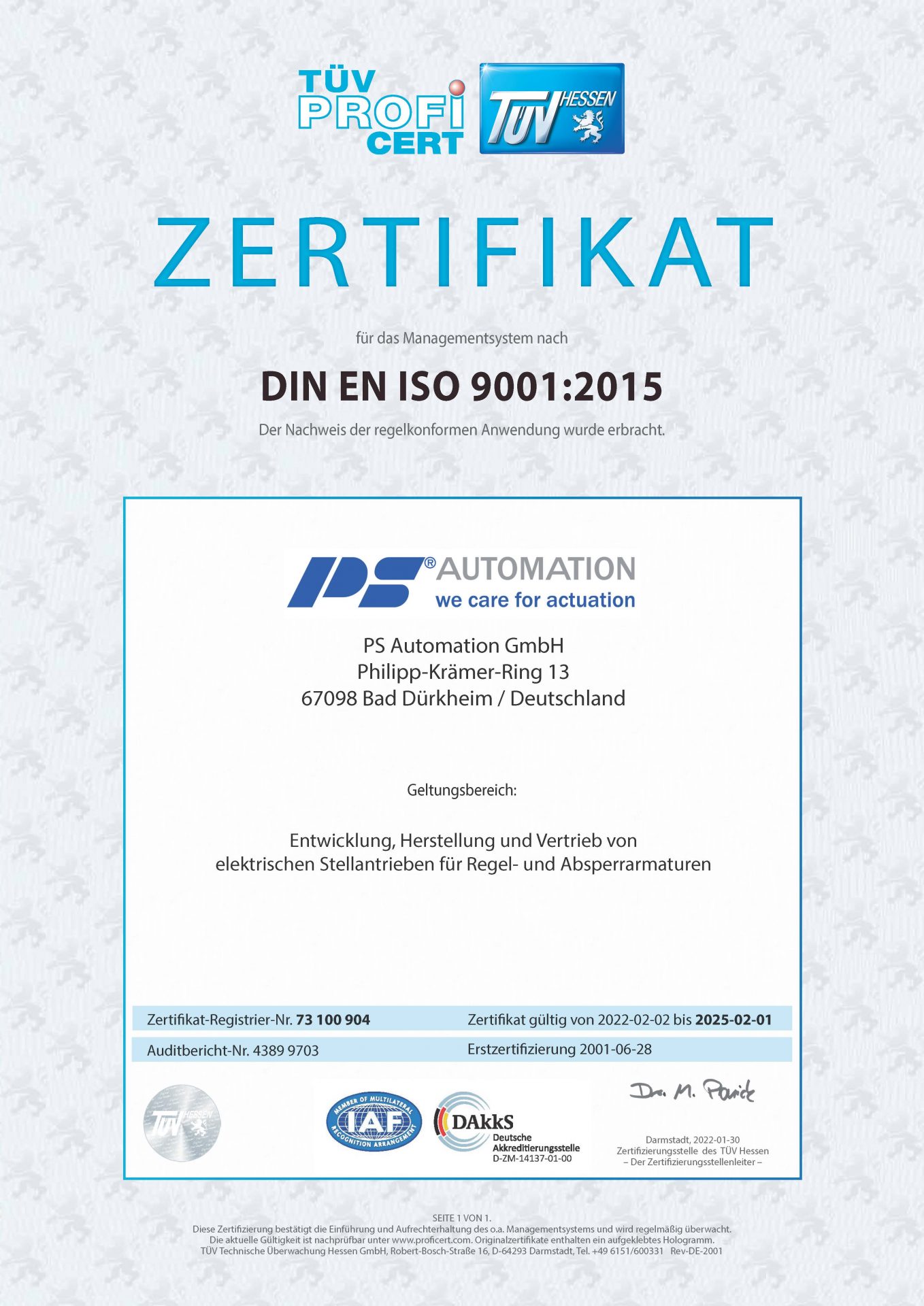 Die PS Automation GmbH arbeitet mit einem integrierten Managementsystem nach DIN EN ISO 9001:2015 und DIN EN ISO 14001:2015. Seit 2001 durchlaufen wir jährlich die Zertifizierung des Qualitätsmanagementsystems nach DIN EN ISO 9001. Im Mai 2018 erhielten wir erstmals die Zertifizierung nach DIN EN ISO 14001, der internationalen Umweltmanagementnorm. Mit der Implementierung dieses Managementsystems hat die PS Automation einen weiteren wichtigen Schritt in Richtung Nachhaltigkeit gesetzt, die das Engagement in allen Bereichen gleichermaßen umfasst und langfristig eine Verbesserung der Firmenstruktur ermöglichen soll.