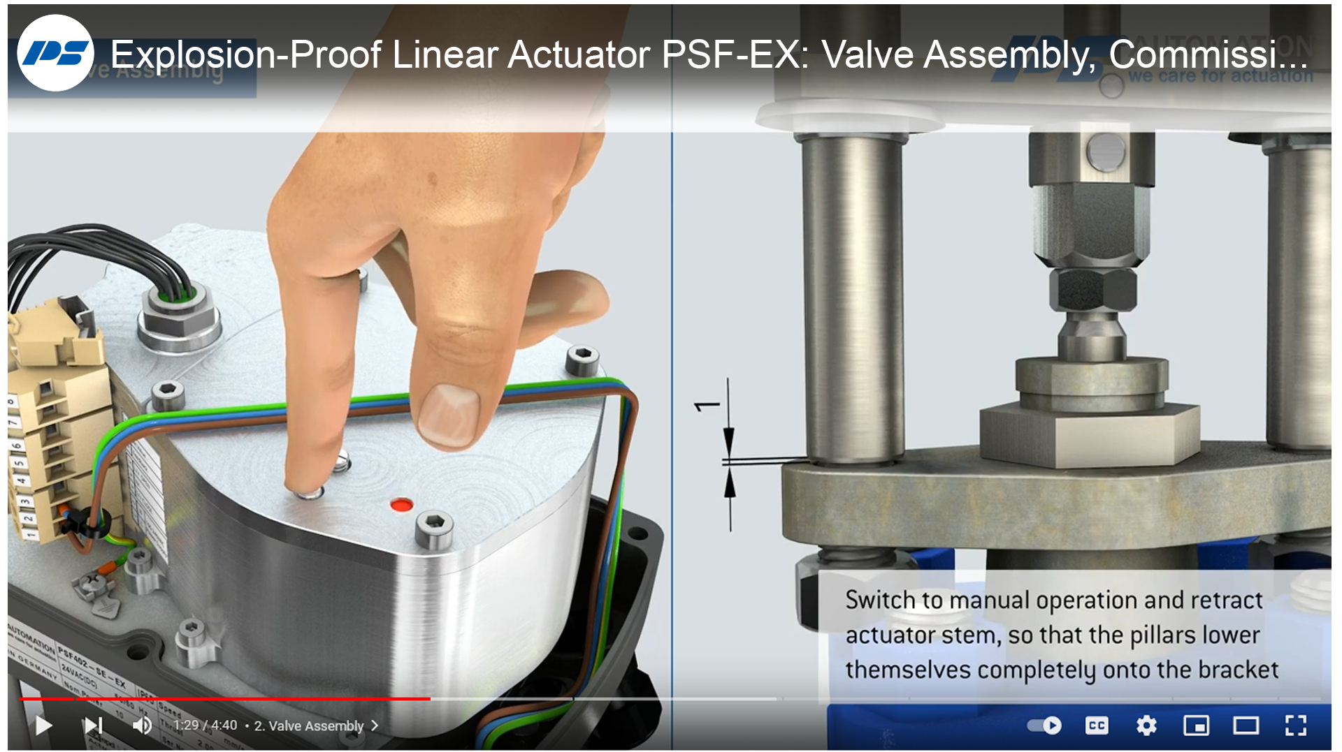 Lineární pohon PSF-EX / PSF-M-EX s schválením ATEX a mechanickým jištěním proti výpadku sítě nebo manuálnímu ovládání disponuje bezdotykovým a neopotřebitelným záznamem dráhy pomocí Hallova senzoru pro přesnou regulaci. Integrovaná spirálová pružina zajišťuje při výpadku napájecího napětí nouzové uzavření, volitelně buď zasunutím nebo vysunutím.